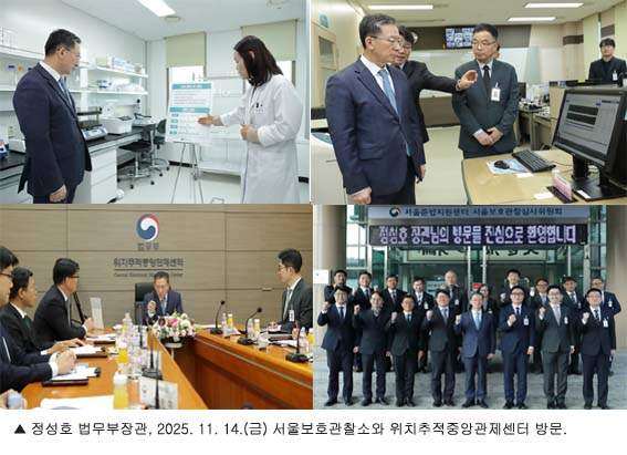 정성호 법무부장관은 2025. 11. 14.(금) 16:00, 서울보호관찰소와 위치추적중앙관제센터를 방문하여 보호관찰, 전자감독 등 범죄예방정책 집행 현장을 점검하고, 직원들의 노고를 격려하는 시간을 가졌다.